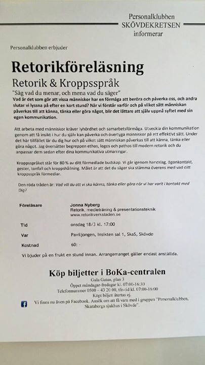 Retorik & Kroppsspråk Personalklubben anordnar olika typer av aktiviteter för sina medlemmar, alltifrån yoga till shoppingturer till Ullared. Igår var det dags att ge sig in i retorikens värld. Lokalen var fullsatt med sjuttio yrkesverksamma personer från olika områden inom SkaS. Föreläsningen var en dryg timma lång och jag pratade om retorikens grunder, kroppsspråk och konsten att lyssna. Jag pratade också om när vår kommunikation inte fungerar, och ingredienserna för att skapa en riktigt effektiv kommunikation. Jag upplevde att igenkänningsfaktorn var hög. Tankar, funderingar och frågor blandades med en härlig stämning och mycket skratt. Ämnet retorik fyller en viktig funktion